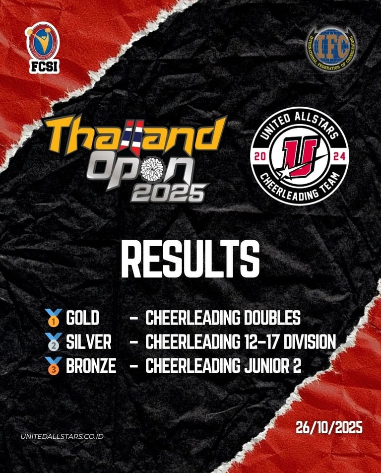 “Thailand Open menjadi pemanasan strategis sebelum kami mewakili Indonesia di Kejuaraan Dunia Cheerleading (CWC) di Takasaki, Jepang pada 10 - 15 Desember 2025. Kami melihat ini bukan hanya kemenangan, tapi validasi atas sistem pembinaan dan arah jangka panjang yang kami bangun," ungkap Ardiyansyah.
